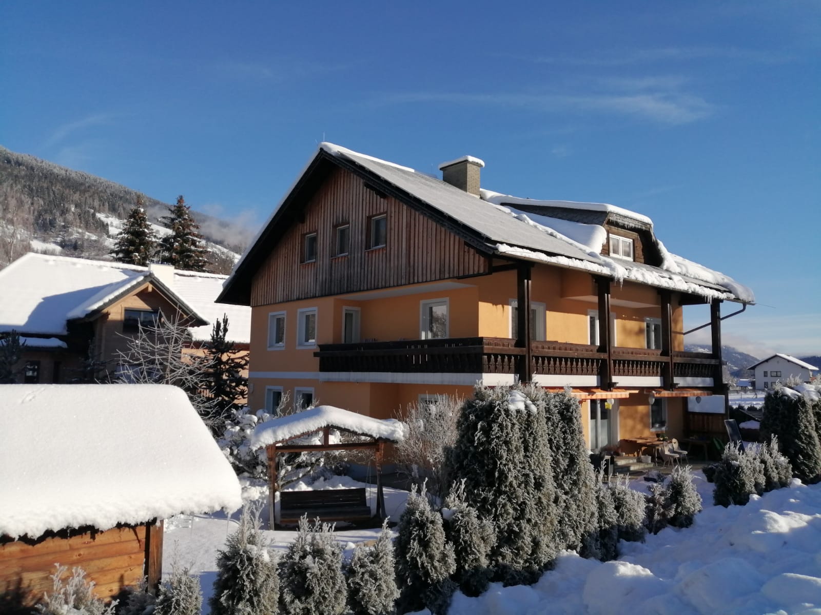 Winter Blick vom Balkon zum Schiberg Kreischberg Spaziergang im Schnee Tiefschneefahren am Kreischberg Murau in der Winterpracht